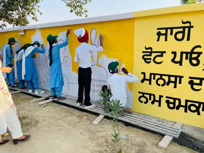 लोकसभा के मद्देनजर मतदाता जागरूकता अभियान के तहत जिला मानसा के निर्वाचन क्षेत्र 97-सरदूलगढ़ के गांव कोट धरमू में जिला चुनाव अधिकारी-कम-डिप्टी कमिश्नर श्री परमवीर सिंह और अतिरिक्त डिप्टी कमिश्नर के निर्देश चुनाव 2024। (जे) श्री निर्मल ओसेपचन के नेतृत्व में, स्कूली छात्रों की दीवार पेंटिंग प्रतियोगिताएं आयोजित की गईं। इन प्रतियोगिताओं का उद्घाटन सहायक रिटर्निंग अधिकारी-कम-एसडीएम सरदूलगढ़, श्री नितेश जैन आईएएस ने किया।