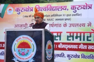 कुरुक्षेत्र, 15 अगस्त। कुरुक्षेत्र विश्वविद्यालय के कुलपति प्रो. सोमनाथ सचदेवा ने आजादी की 78वीं वर्षगांठ के अन्तर्गत स्वतंत्रता दिवस पर कुरुक्षेत्र विश्वविद्यालय के श्रीमद्भगवद्गीता सदन में राष्ट्रीय ध्वजारोहण किया व एनसीसी परेड की सलामी लेकर शहीदों को नमन किया। इस मौके पर विश्वविद्यालय के संगीत एवं नृत्य विभाग, आईआईएचएस, यूटीडी व यूनिवर्सिटी सीनियर सेकेंडरी मॉडल स्कूल के विद्यार्थियों ने देशभक्ति से ओतप्रोत कार्यक्रम प्रस्तुत किए।