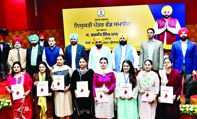 मिशन रोजगार जारी रखते हुए पंजाब के मुख्यमंत्री भगवंत सिंह मान ने बुधवार को 497 युवाओं को सरकारी नौकरियों के लिए नियुक्ति पत्र सौंपे। इसके साथ ही मुख्यमंत्री ने अपने कार्यकाल के लगभग तीन सालों के भीतर 50892 परिवारों के जीवन को रोशन कर एक नया मील का पत्थर स्थापित किया है। मुख्यमंत्री ने आज जल आपूर्ति और स्वच्छता विभाग, स्कूल शिक्षा विभाग, उच्च शिक्षा और भाषाएं, ग्रामीण विकास और विज्ञान, तकनीक और पर्यावरण विभाग में भर्ती हुए युवाओं को नियुक्ति पत्र सौंपे। यहां म्यूनिसिपल भवन में एकत्रित हुए लोगों को संबोधित करते हुए मुख्यमंत्री ने कहा कि यह एक यादगार अवसर है। जब ये युवा पंजाब सरकार के परिवार का हिस्सा बन रहे हैं। उन्होंने उम्मीद जताई कि ये युवा इन संबंधित विभागों में शामिल होकर राज्य के सामाजिक आर्थिक विकास में सक्रिय भागीदार बनेंगे। भगवंत सिंह मान ने कहा कि राज्य के इतिहास में पहली बार किसी भी सरकार ने सत्ता में आने के 35 महीनों के भीतर युवाओं को रिकॉर्ड 50892 नौकरियां दी हैं।