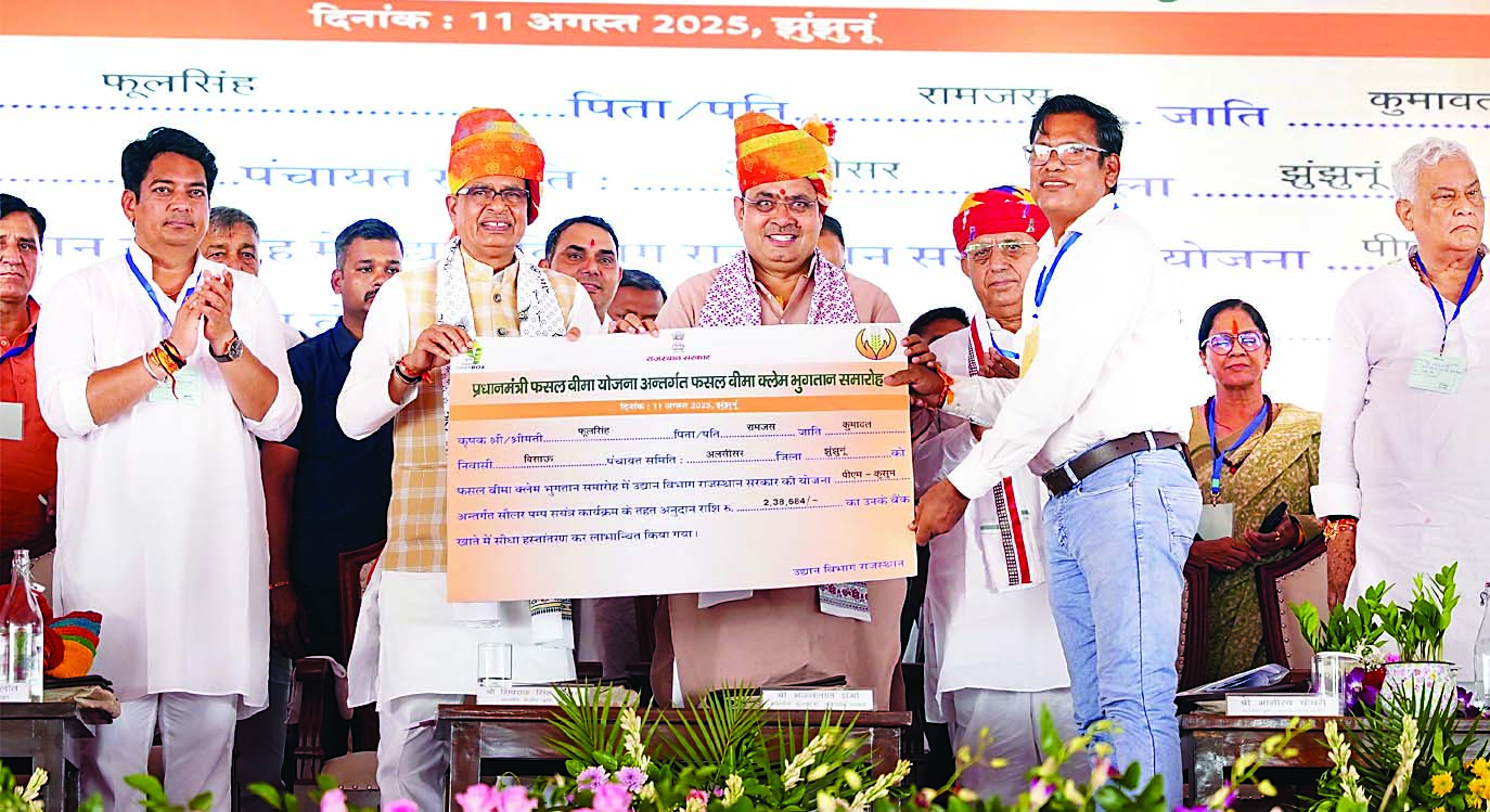 राजस्थान के झुंझुनू से केंद्रीय कृषि एवं किसान कल्याण मंत्री शिवराज सिंह चौहान तथा राजस्थान के मुख्यमंत्री भजनलाल शर्मा द्वारा प्रधानमंत्री फसल बीमा योजना (पीएमएफबीएम) के अंतर्गत डीबीटी-आधारित दावा राशि का राष्ट्रव्यापी डिजिटल हस्तांतरण किया गया। इस अवसर पर रबी 2024-25 एवं पूर्ववर्ती सीजनों की पहली किस्त के तहत प्रत्यक्ष लाभ अंतरण के माध्यम से 35 लाख से अधिक किसानों के बैंक खातों में 3900 करोड़ से अधिक की राशि सीधे भेजी गई। केवल राजस्थान के 9.70 लाख से अधिक किसानों को लगभग 1426 करोड़ का भुगतान किया गया।
