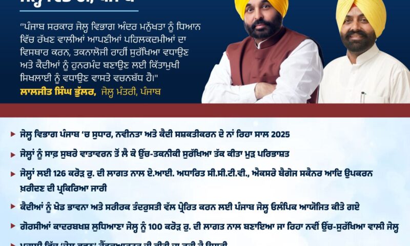 पंजाब जेल विभाग ने आज अपनी साल-एंड प्रगति रिपोर्ट जारी करते हुए वर्ष 2025 में की गई विभिन्न पहलकों को उजागर किया, जिन्होंने राज्य की जेल सुविधाओं को पुनर्वास, स्थिरता और आधुनिक सुरक्षा केंद्रों में बदल दिया है।